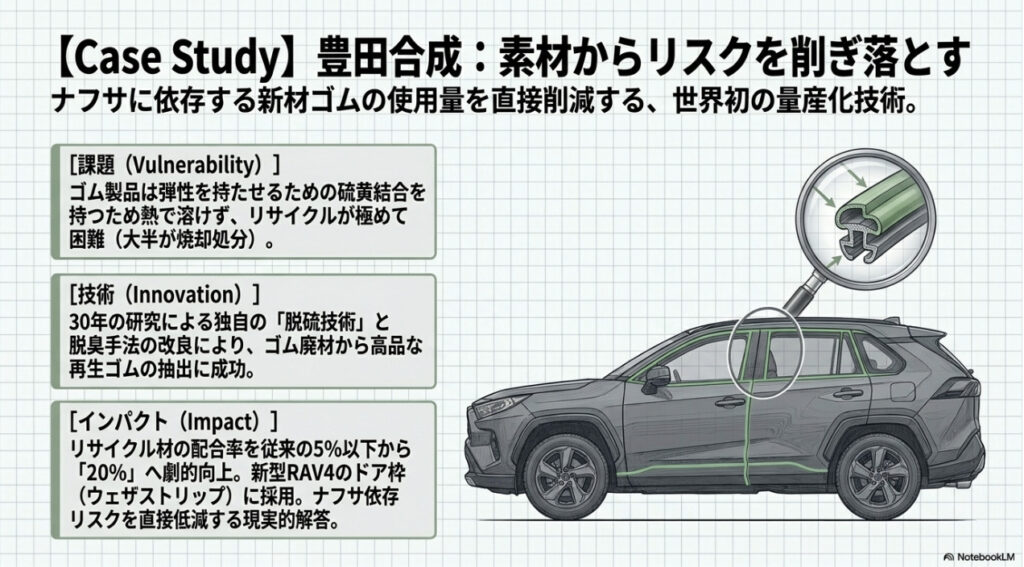 ナフサ危機が深刻化するなか、最も注目を集めているサプライヤーの取り組みが豊田合成のゴムリサイクル技術です。ゴム製品は弾性を持たせるために硫黄結合を持ち、熱を加えても溶けないため、プラスチックや金属と異なりリサイクルが極めて困難でした。廃ゴムの多くはこれまで燃料として焼却処分されてきたのが現実です。
