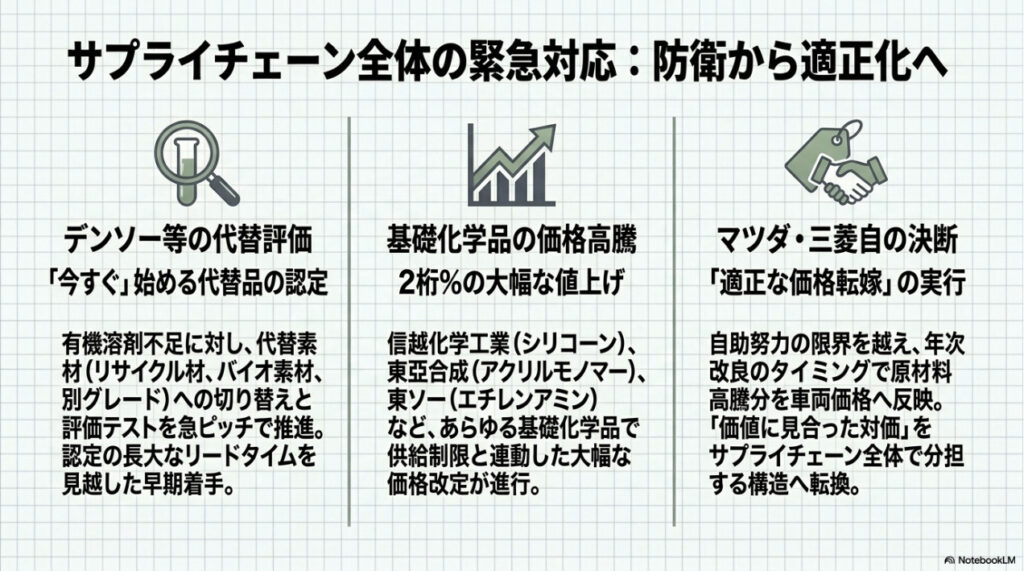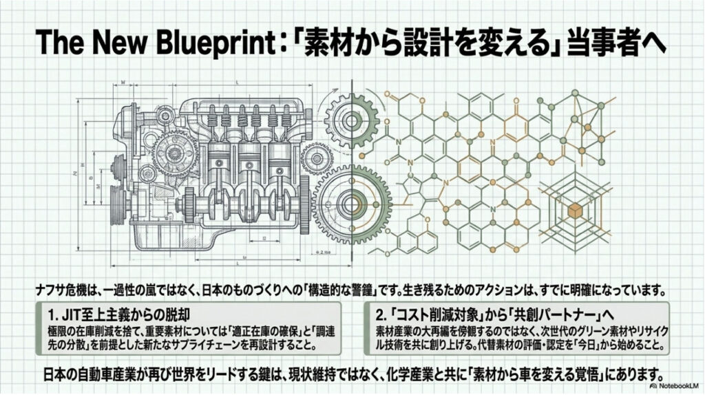 素材産業の大胆な再編を「化学屋さんの話」として傍観するのではなく、次世代のグリーン素材やリサイクル技術を共に創り上げるパートナーシップの機会として捉え直すこと。部品メーカーであれば、代替素材の評価・認定を今すぐ始めること。完成車メーカーであれば、JIT至上主義を見直し、重要素材については「適正在庫の確保」という新たなサプライチェーン設計に本腰を入れること。これが今この瞬間にすべき行動です。