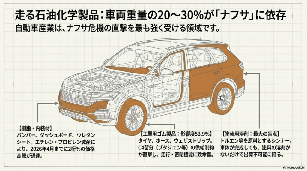 現代の自動車は「走る石油化学製品」と言っても過言ではありません。ナフサから作られるポリプロピレン、合成ゴム、エンジニアリングプラスチック、塗料は、車両重量の約20〜30%を占め、機能の要を担っています。つまり、自動車産業はナフサ危機の「直撃を受ける産業」のひとつなのです。