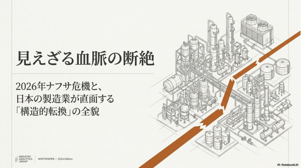 今回のナフサ危機は、中東情勢という外部要因によって引き起こされた「一過性の嵐」ではありません。それは、日本のものづくりの足場がいかに危ういバランスの上に成り立っていたかを突きつける「構造的な警鐘」です。