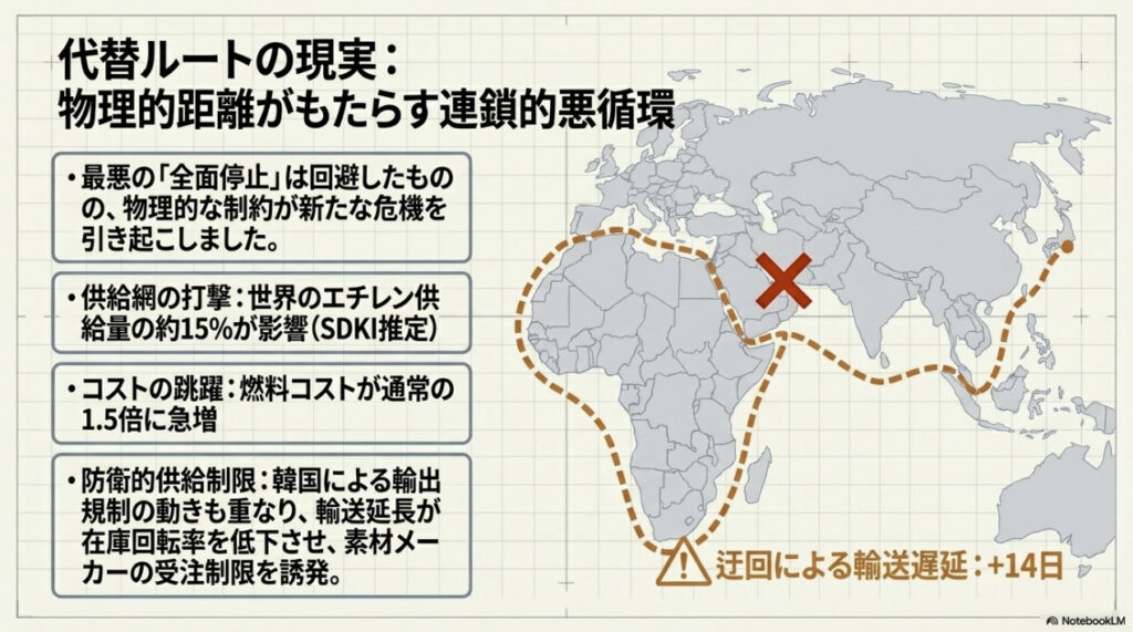 この代替調達によって、エチレン設備の「全面停止」という最悪のシナリオはかろうじて回避されました。しかし、アフリカ南端の喜望峰ルートを経由する場合、輸送日数は通常より14日増加し、燃料コストは1.5倍に跳ね上がると試算されています。この輸送期間の延長は、在庫回転率の低下とキャッシュフローの圧迫をもたらすだけでなく、素材メーカーが将来の不確実性を見越して受注を制限する「防衛的供給制限」という悪循環をも引き起こしました。