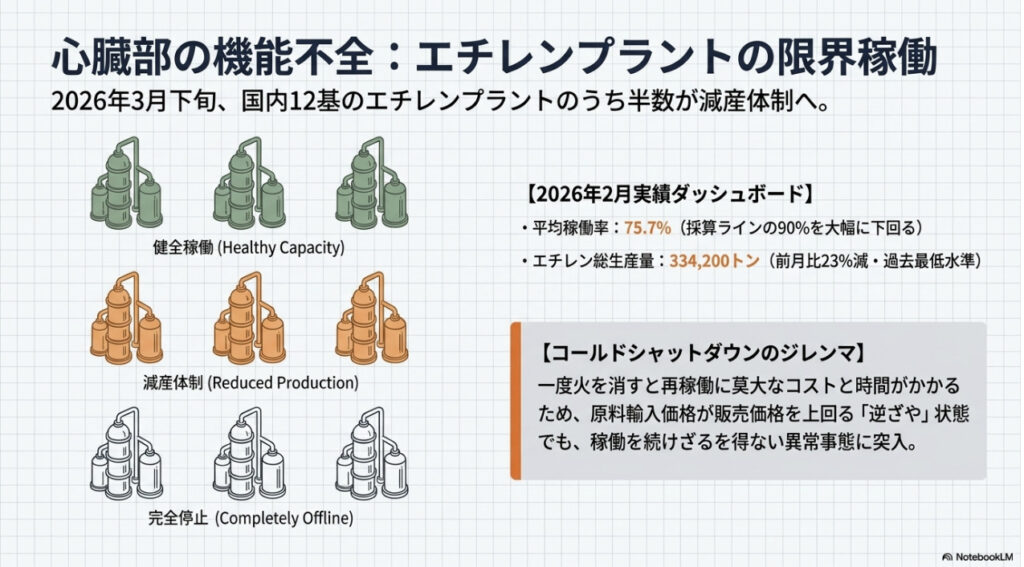 2026年3月下旬の段階で、国内に12基存在するエチレンプラントのうち、半数の6基がすでに減産体制に入り、フル稼働を維持できているのはわずか3基という異常事態が発生しました。また、日本石油化学工業協会のデータに基づく調査では、2026年2月のナフサ分解装置の平均稼働率は75.7%と、前年比でも急落。同月のエチレン総生産量は前月比23%減の334,200トンと、過去最低水準を記録しています。