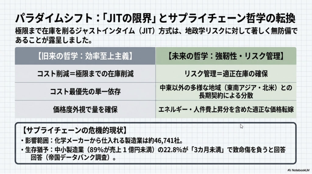 さらに、ジャストインタイム(JIT)生産方式の脆弱性も改めて問われています。平時の在庫コスト削減に最適化されたサプライチェーンは、地政学リスクという長期的・突発的な供給断絶に対して著しく無防備であることが白日の下にさらされました。