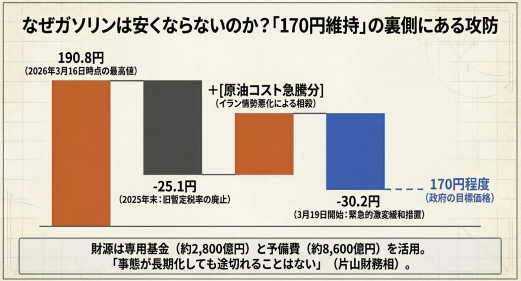 2025年末の暫定税率廃止で約25.1円の税負担は消えた。しかしその直後から原油価格が急騰したことで、その恩恵は帳消しどころかマイナスになってしまった。政府の補助金再開は、その「再値上がり」を防ぐ防波堤の役割を果たしている。