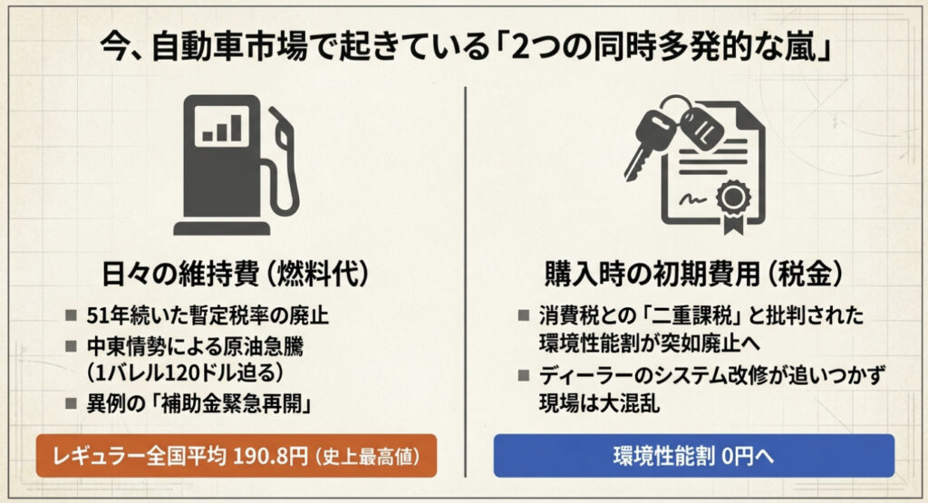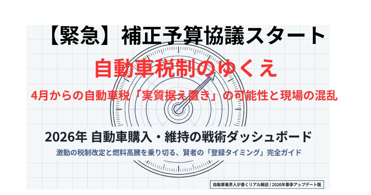 2026年の年明け早々から、自動車ユーザーを取り巻く税制・燃料価格の環境は嵐のように揺れ動いている。ガソリン暫定税率の廃止、イラン情勢急変による原油価格の急騰、補助金の緊急再開――。これらは互いに絡み合いながら、ドライバーの家計とディーラーの商談現場を同時に直撃している。「いったい何が起きているのか」を体系的に整理できていない人は、決して少なくないはずです。