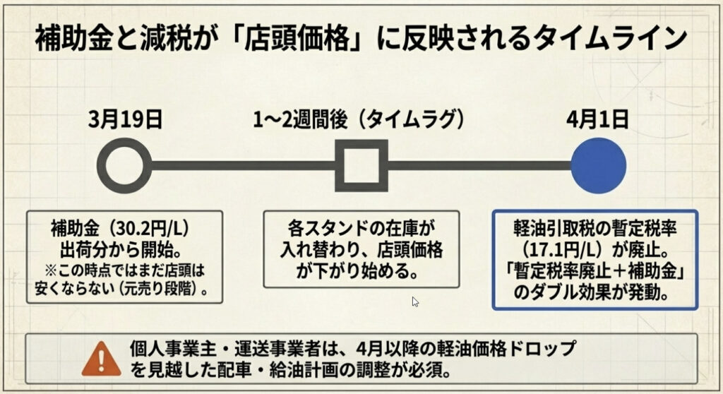 重要なのは「3月19日から即座に安くなるわけではない」という点だ。補助金は石油元売り各社への卸売段階で支給されるため、各ガソリンスタンドの在庫が補助前に仕入れた分が残っている間は、店頭価格への反映が遅れる。経済産業省は「店頭反映に1〜2週間かかる」と説明しており、実際に安くなるのは3月末〜4月上旬が見込みとされている。