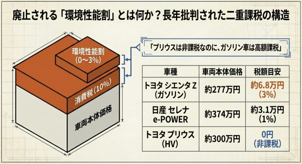 この「プリウスは非課税なのに、シエンタのガソリン車は7万円近く払う」という状況が長年続いてきた。しかも消費税は全車に課されるため、環境性能割が課される車は「消費税+環境性能割」という二重課税になると批判されてきた。