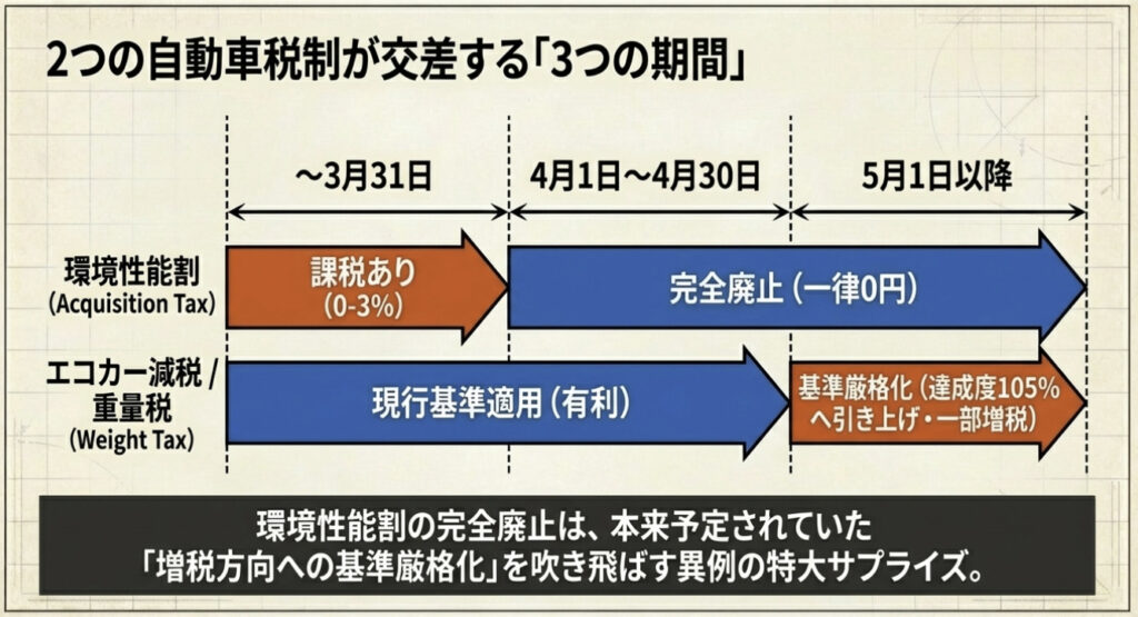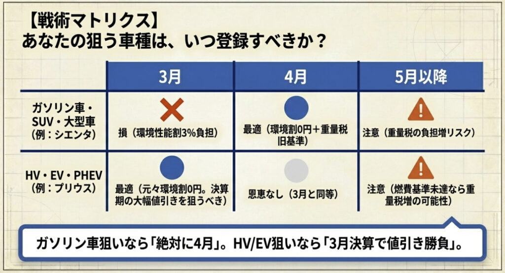 | 5月以降 | 焦りは禁物だが、重量税の基準厳格化前に車種の燃費達成率を必ず確認 |