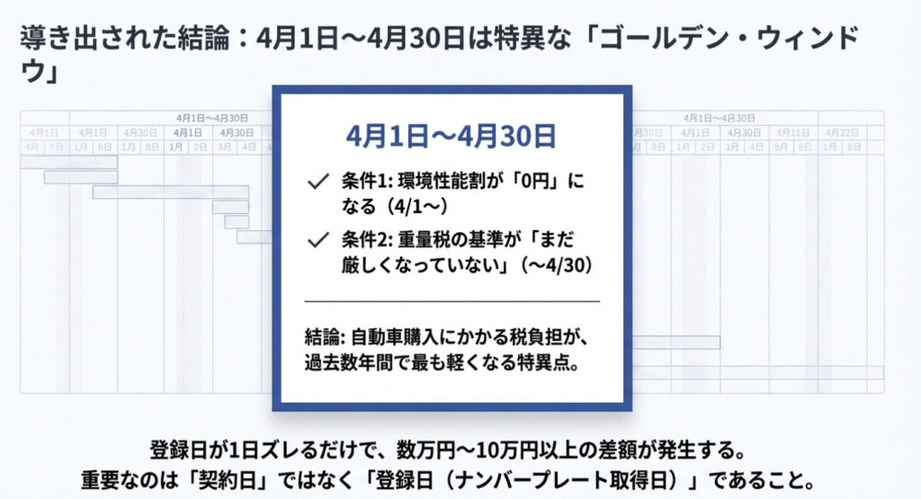 - 差額:約10.8万円(4月登録が有利)