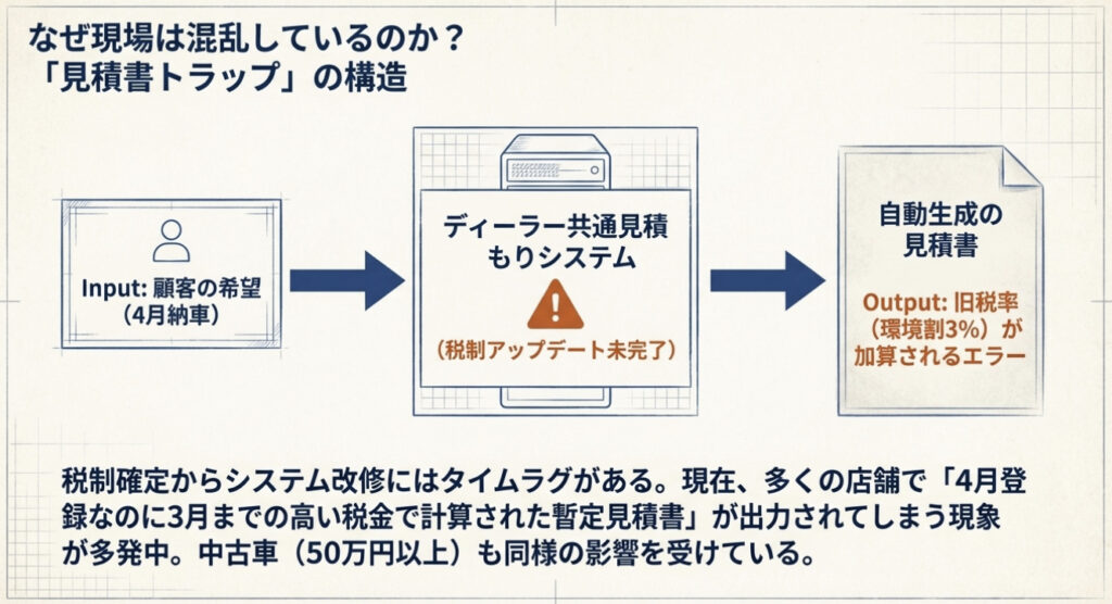 自動車ディーラーが使う見積もりシステムは、グレード・オプション・登録月・顧客種別(個人・法人・営業用)などを組み合わせて自動計算する。環境性能割の廃止はこのシステムに大きな変更を要するが、税制の確定から実際のシステム反映まではどうしてもタイムラグが生じる。
