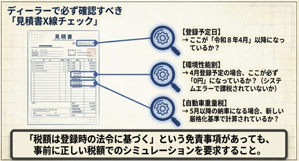 → 差額(環境性能割分)はユーザーに返金・値引き処理が原則。見積書に「税額は登録時の法令に基づく」と明記されている場合、返金義務はないが、多くのディーラーは差額を返金することになります。