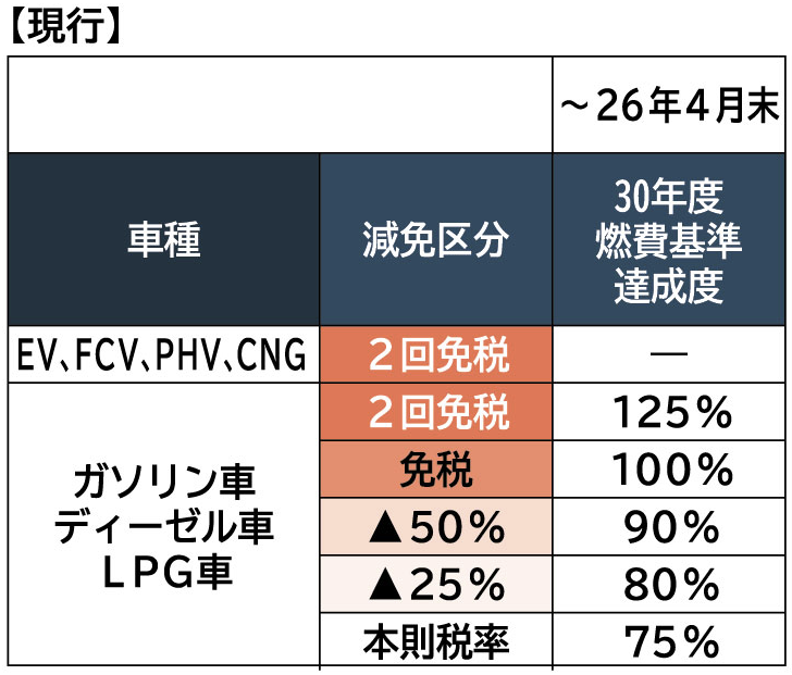この措置により、EVの場合、新車登録時などの自動車重量税が初回と2回目の車検時まで全額免除される現行の優遇が、2026年4月末以降も継続されることになります。