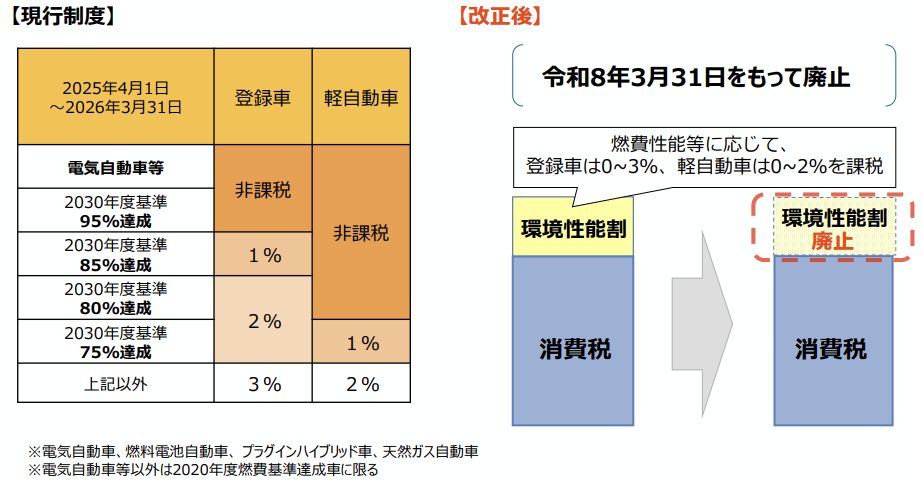 - 2026年4月:環境性能割廃止、取得時負担の簡素化