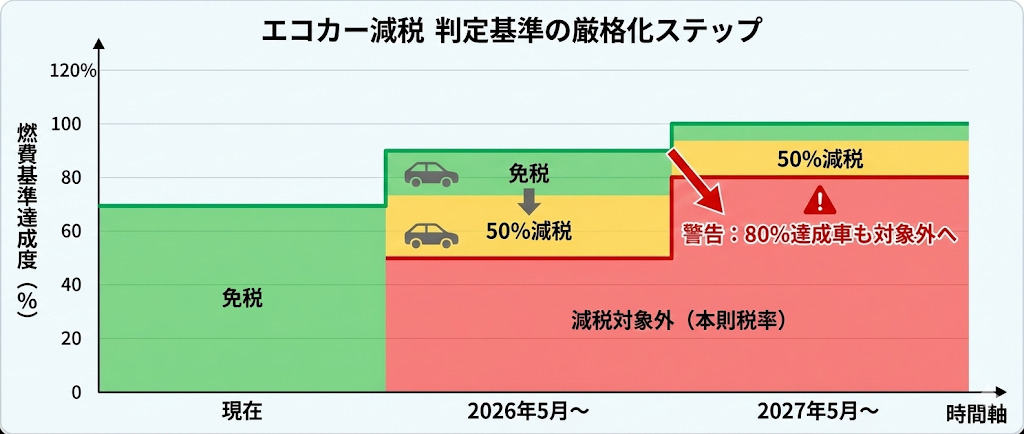 - 2026年5月以降:エコカー減税の基準が厳格化。車種選択に注意