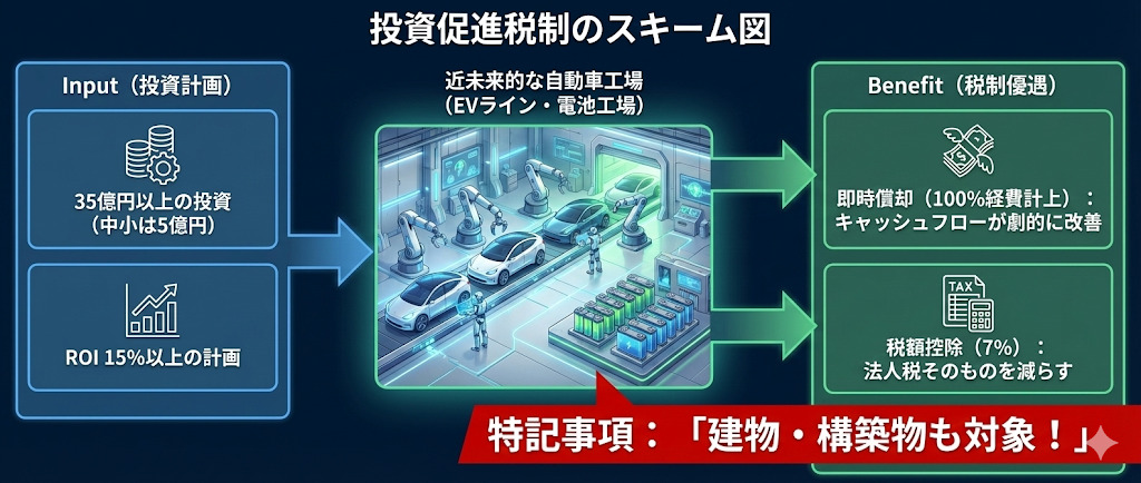 日本の自動車産業が世界で勝ち抜くため、政府は「特定生産性向上設備等投資促進税制」という強力な武器を用意しました。