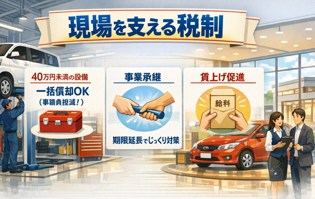 特に少額減価償却資産の特例が「30万円未満」から「40万円未満」に引き上げられる点は、最新のOBD検査機器や特定整備用ツールの導入を検討している整備工場にとって朗報です。