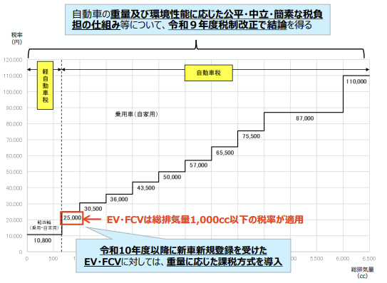 | 令和10年(2028年)以降 | 新車登録されるEV・FCV | 排気量ゼロ区分ではなく、車両重量に応じた新税率を適用 |