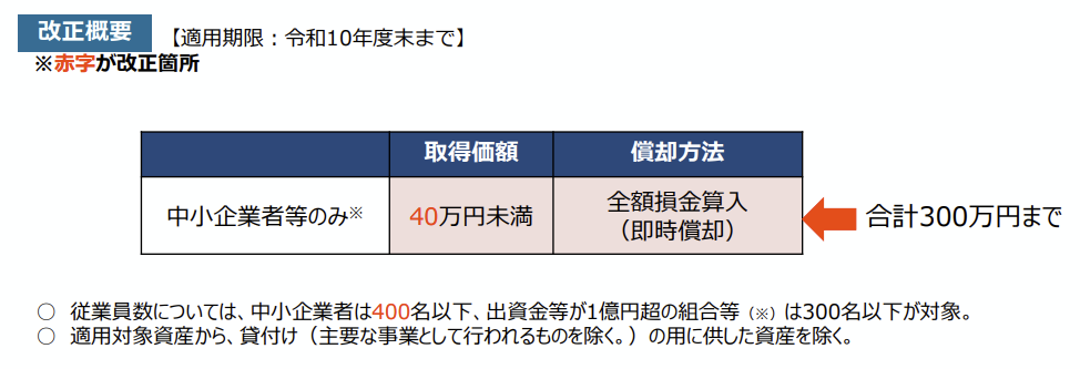 30万円未満だった即時償却の対象が、40万円未満に引き上げられます。