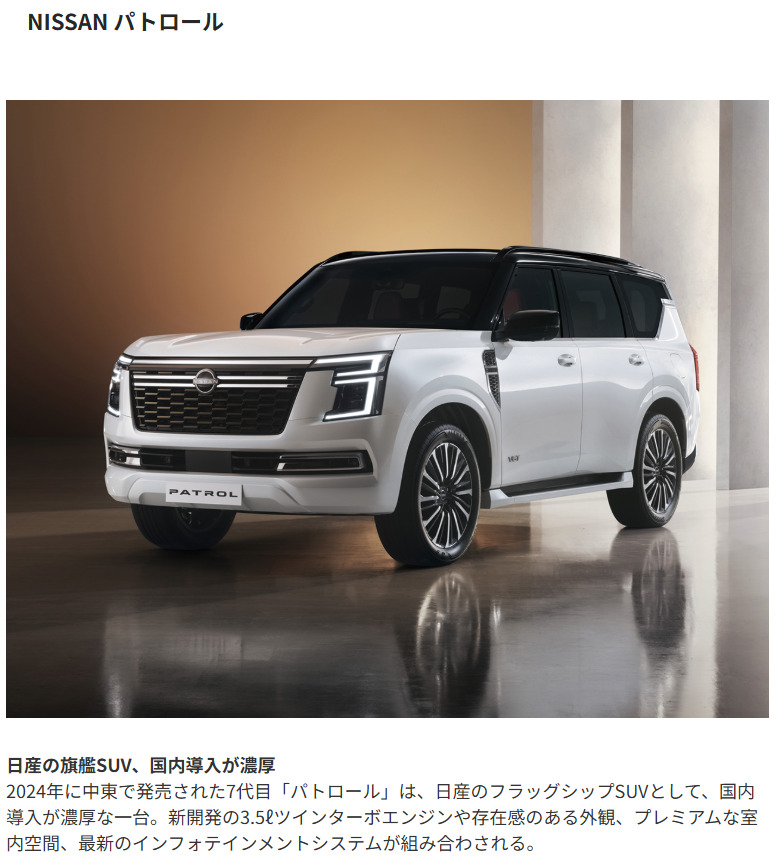 - 「パトロール」:2027年度前半に日本市場投入を発表