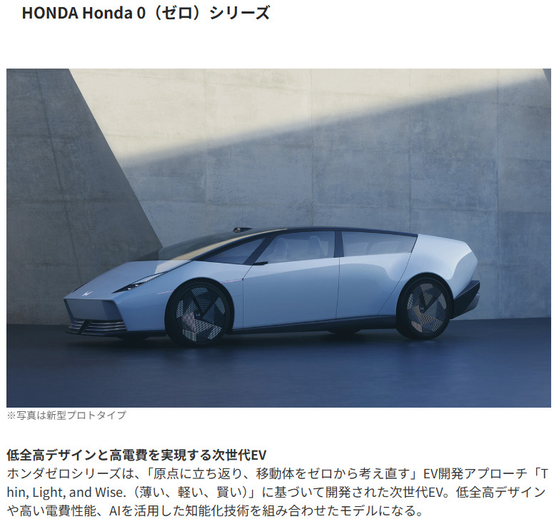 ホンダブースでは、「原点に立ち返り、移動体をゼロから考え直す」というアプローチに基づいた新世代EV「0(ゼロ)シリーズ」のコンセプト群が披露されました。