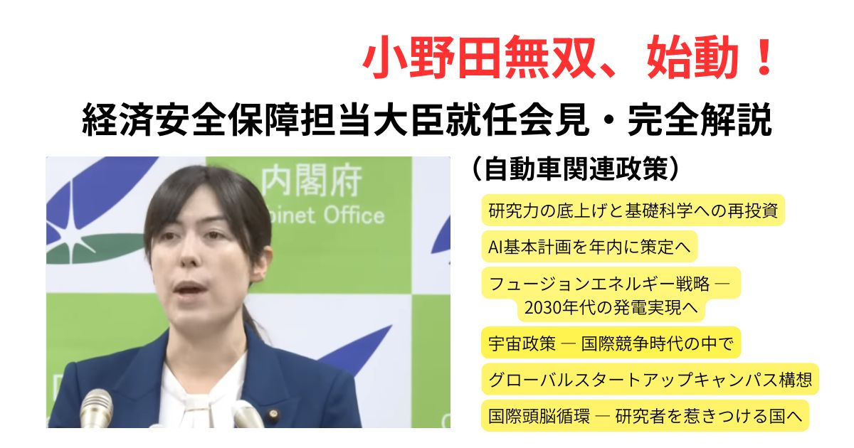 本記事は、小野田紀美経済安全保障担当大臣の2025年10月22日就任会見をもとに、各種公開資料および報道内容を参考に作成しました。自動車業界への影響分析については、筆者の知見と業界動向調査に基づく考察を含みます。